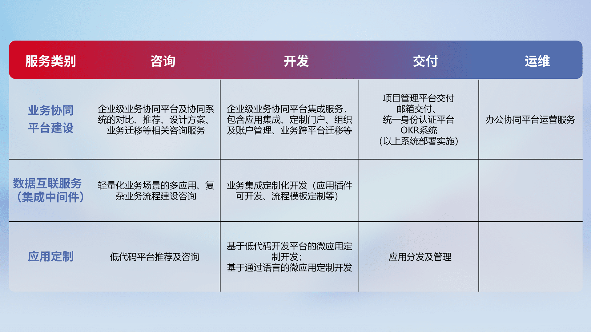 针对钉钉、、、企微、、IDaas等平台级产品提供产品的规划、、、、方案、、、、交付、、、、定制化开发等服务,,实现如统一协同办公、、、智能客户服务、、混合会议管理、、智能数据查询、、、等业务场景,,,,实现数字化转型。。