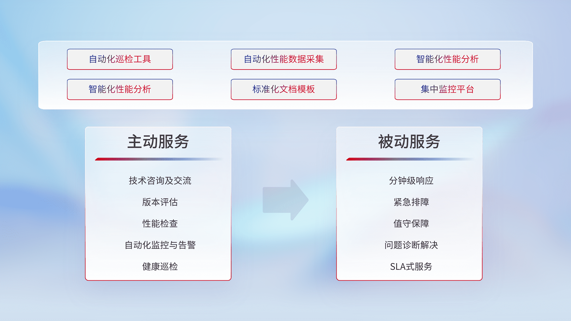 智能化工具和标准化文档,,,保障服务质量,,提供主动服务(包含技术咨询、、、版本评估、、性能检查、、、自动化监控与告警、、、、健康巡检)和被动服务包含(分钟级响应、、紧急排障、、、值守保障、、问题诊断解决、、、SLA服务)。。