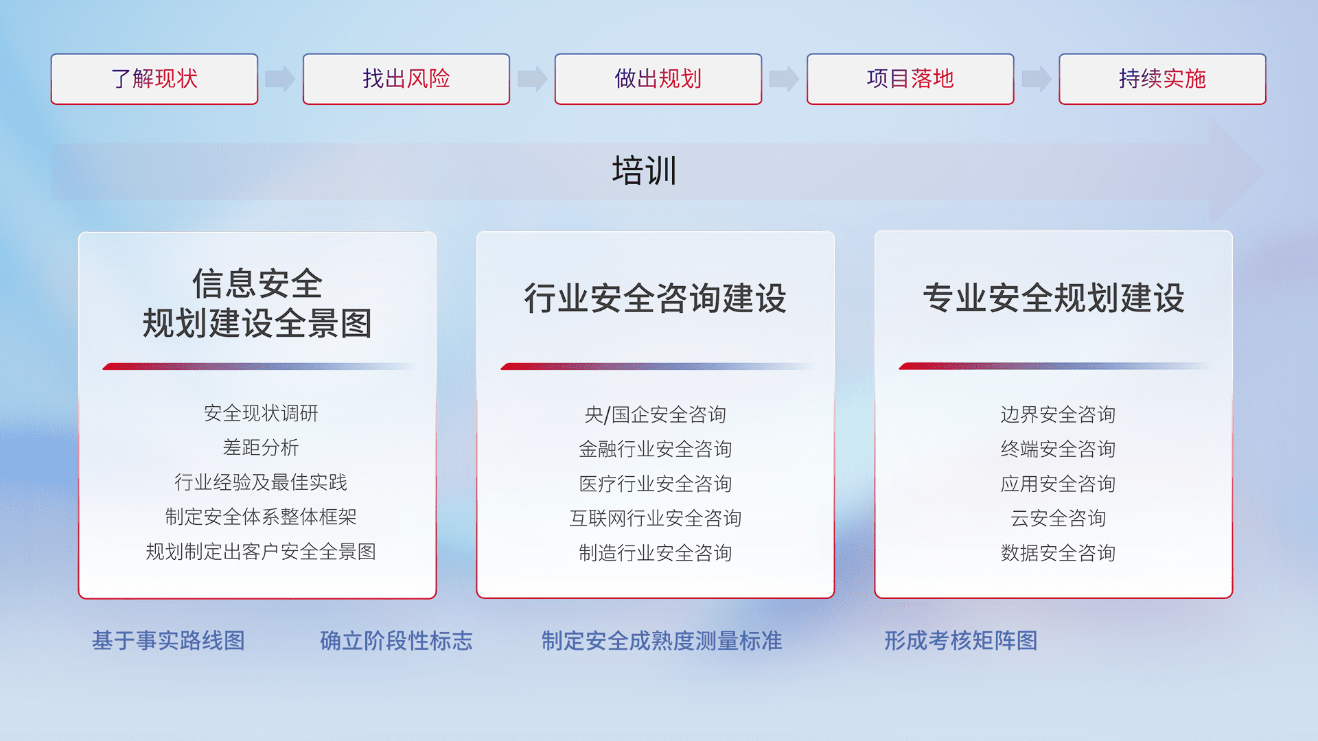 针对客户行业特性,,,,以专业的安全服务+多厂商联合解决方案提供专属的一站式安全管理服务,,帮助客户全面感知网络空间威胁,,,,基于识别、、检测、、、分析、、、、防护、、监测、、、、响应的服务理论模型,,,,从方案咨询、、集成交付、、、、评估验证、、、、优化加固、、、、运维运营,,,致力于为客户提供完整的闭环管理式安全服务。。。。以实战经验为客户打造高抵御风险的安全体系,,,,帮助客户发现威胁、、对抗威胁、、、处置威胁,,,不断积累安全对抗能力,,,持续保障数字化安全。。。。