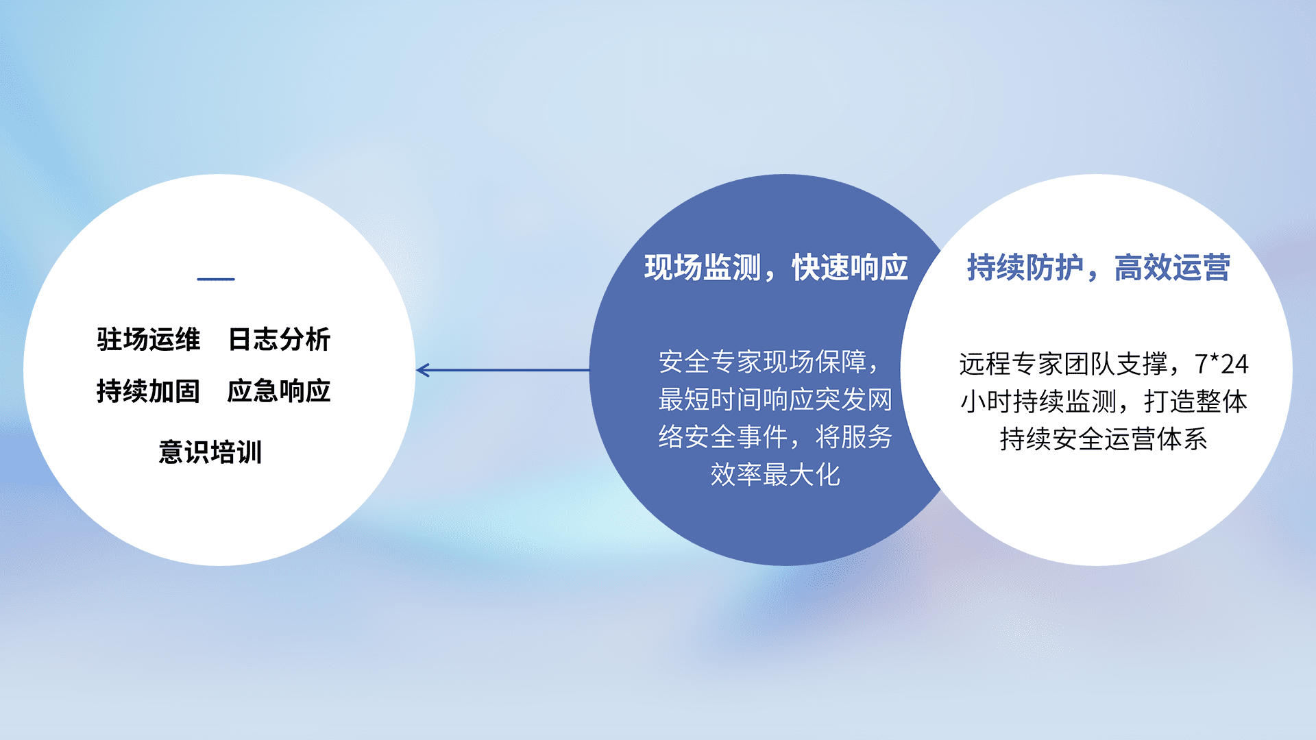 针对客户行业特性,,,,提供专属的一站式安全管理服务,,,,帮助客户全面感知网络空间威胁,,,,通过安全专家的线上、、、、线下防护支持,,实现风险闭环,,,,将安全保障常态化,,为客户打造常态化安全运维运营服务。。。。
